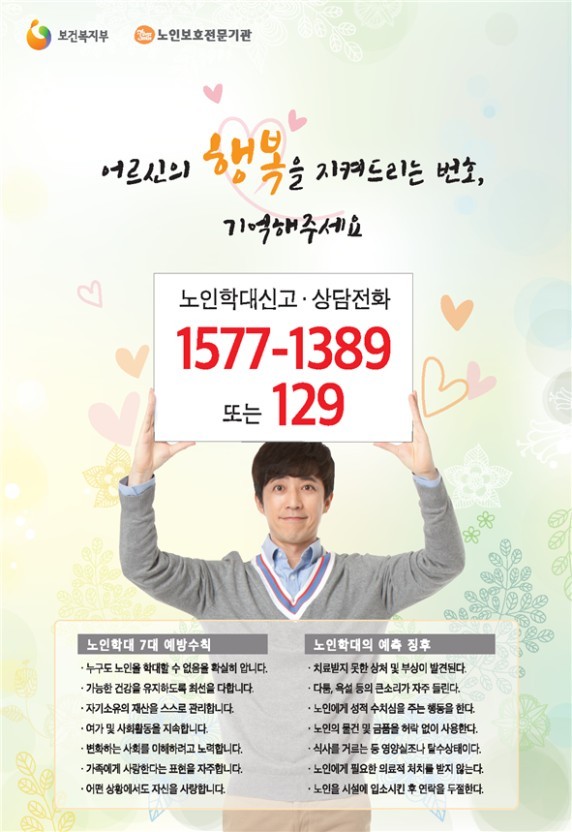 선한이웃의집 다함께 알아가는 노인인권보호와 노인학대예방 * 노인학대 7대 예방수칙 1. 누구도 노인을 학대할 수 없음을 확실히 압니다. 2. 가능한 건강을 유지하도록 최선을 다합니다. 3. 자기소유의 재산을 스스로 관리합니다. 4. 여가 및 사회활동을 지속합니다. 5. 변화하는 사회를 이해하려고 노력합니다. 6. 가족에게 사랑한다는 표현을 자주합니다. 7. 어떤 상황에서도 자신을 사랑합니다. 노인학대예측징후 1. 치료받지 못한 상처 및 부상이 발견된다. 2. 다툼,욕설 등의 큰소리가 자주 들린다. 3. 노인에게 성적 수치심을 주는 행동을 한다. 4. 노인의 물건 및 금품을 허락 없이 사용한다. 5. 식사를 거르는 등 영양실조나 탈수상태이다. 6. 노인에게 필요한 의료적 처치를 받지 않는다. 7. 노인을 시설에 입소시킨 후 연락을 두절한다. 노인학대 신고전화번호 : 1577-1389 or 129 선한이웃의집은 노인인권을 보호하고 노인학대예방을 위해서 주기적인 교육을 통해서 어르신을 존중하는 마음을 가지고 노인학대예방을 위해 노력하고 있습니다. |